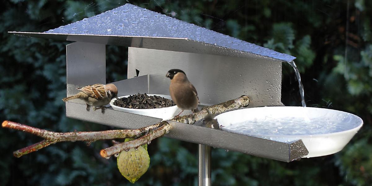 Mit Vogelhäusern und Vogeltränken in moderner Architektur, zur ganzjährigen Unterstützung von Vögeln. Vogelfutterstellen, die Sie nicht nach einigen Jahren entsorgen müssen, langlebig aufgrund ihrer unverwüstlichen Materialen Edelstahl, beschichtetes Aluminium und Cortenstahl, die sich bestens in moderne wie romantische Gärten einfügen lassen.