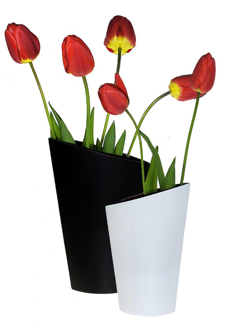Ein Blatt stand Pate bei der Gestaltung, von oben leicht zu erkennen. Dieses Vasen-Set besteht aus 2 flachen Vasen aus gebürstetem Edelstahl oder in schwarz-weißer Lackierung, mit einem verstärkten Boden für einen sicheren Stand