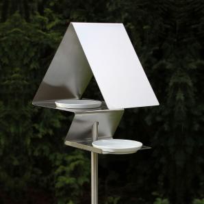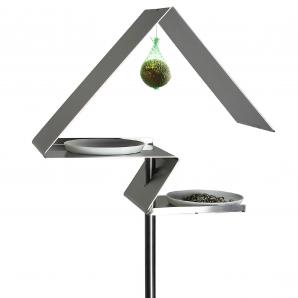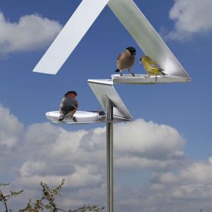 For some, this stainless steel bird snack symbolizes a tree, for others it symbolizes the shape of a house. The birds don't care. They like this feeder.