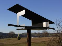 Ansonsten ist es identisch mit unserem VH-6 mit einemschrägen Dach aus Schiefer und einem puristischen Grundkörper aus Edelstahl, nur proportional vergrößert. Auch hier können Sie einen selbst gesuchten (oder unten bestellten) Ast als natürliche Landehilfe einstecken und einen Meisenknödel aufhängen.