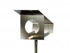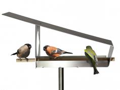 A sloping roof, straight lines and generous openings characterize this purist feeding place for birds. Based on the design of our VH-6 with a slate roof, this feeding station is made from just one piece of stainless steel. A wooden stick serves as a landing aid, which is inserted from the front and locks itself in place.