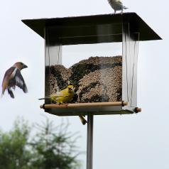 With a filling volume of over 4 liters (enough for more than 1.5kg of sunflower seeds), a good supply of food is ensured. To refill the slanted slate roof is simply removed.