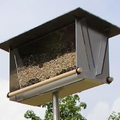 Stainless steel birdhouse with viewing windows and large feeding silo for 3 liters of food. Particularly interesting with layers of egg-filled, different types of bird food such as black and peeled sunflower seeds. With a roof made of natural slate.