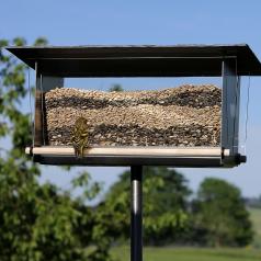 With this bird house we let birds become artists. If you fill different types of food between the large viewing windows made of acrylic glass, interesting, graphic structures emerge.