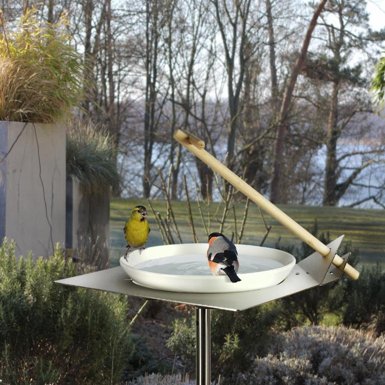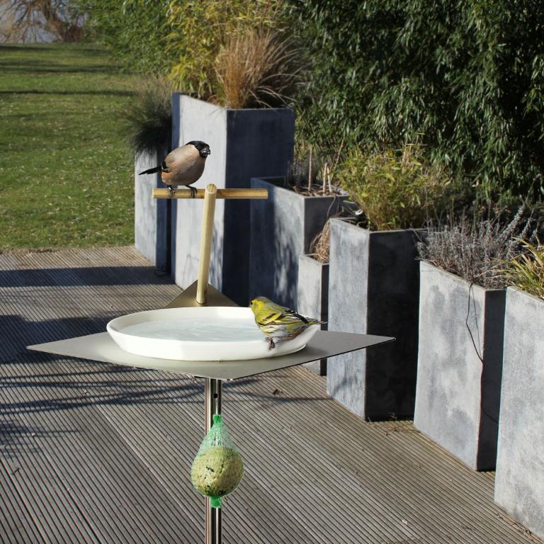 And if you're hungry, you can also buy a fat ball. You will find a hook for hanging as an accessory.Square Circle Triangle Puristic design of a bird bath.