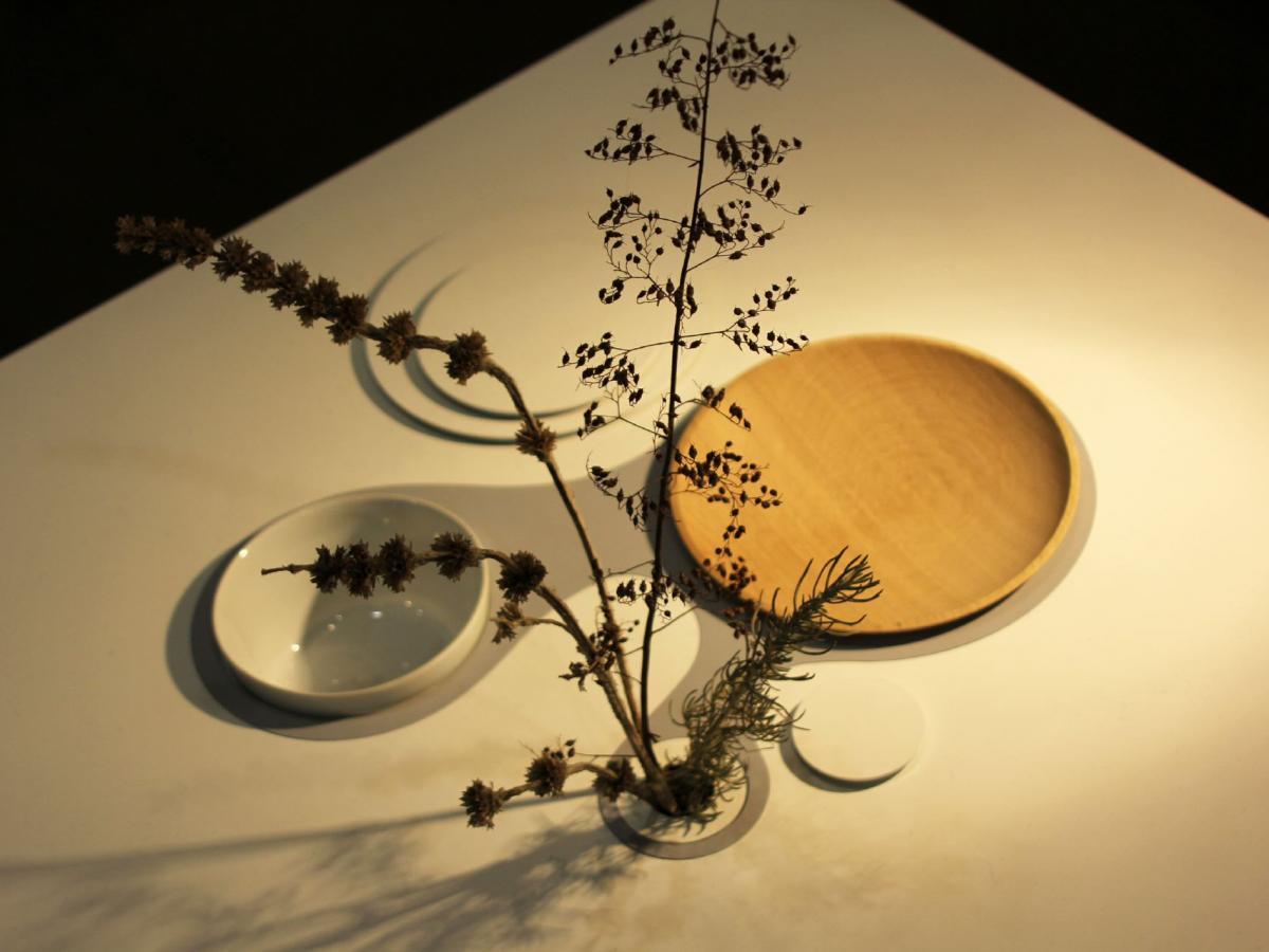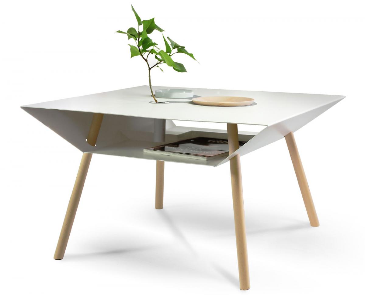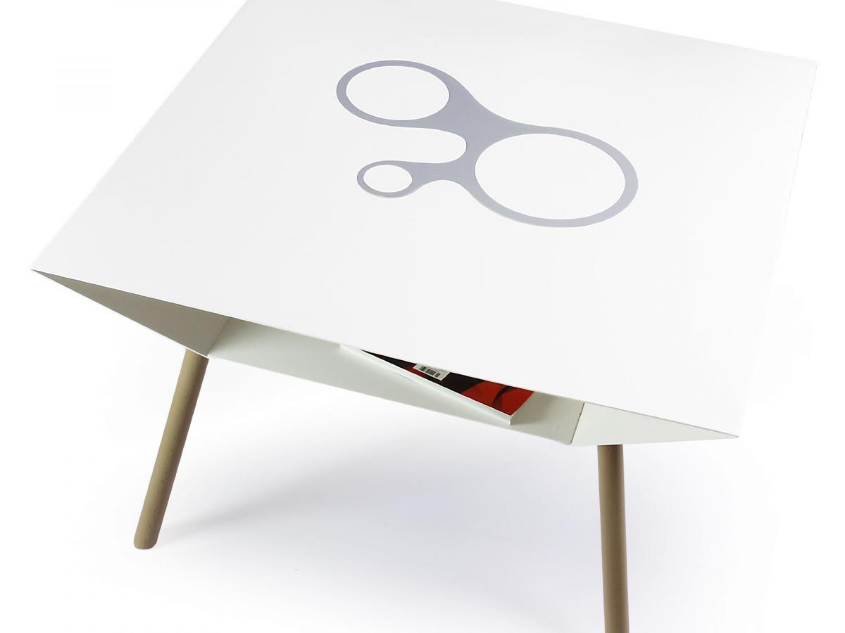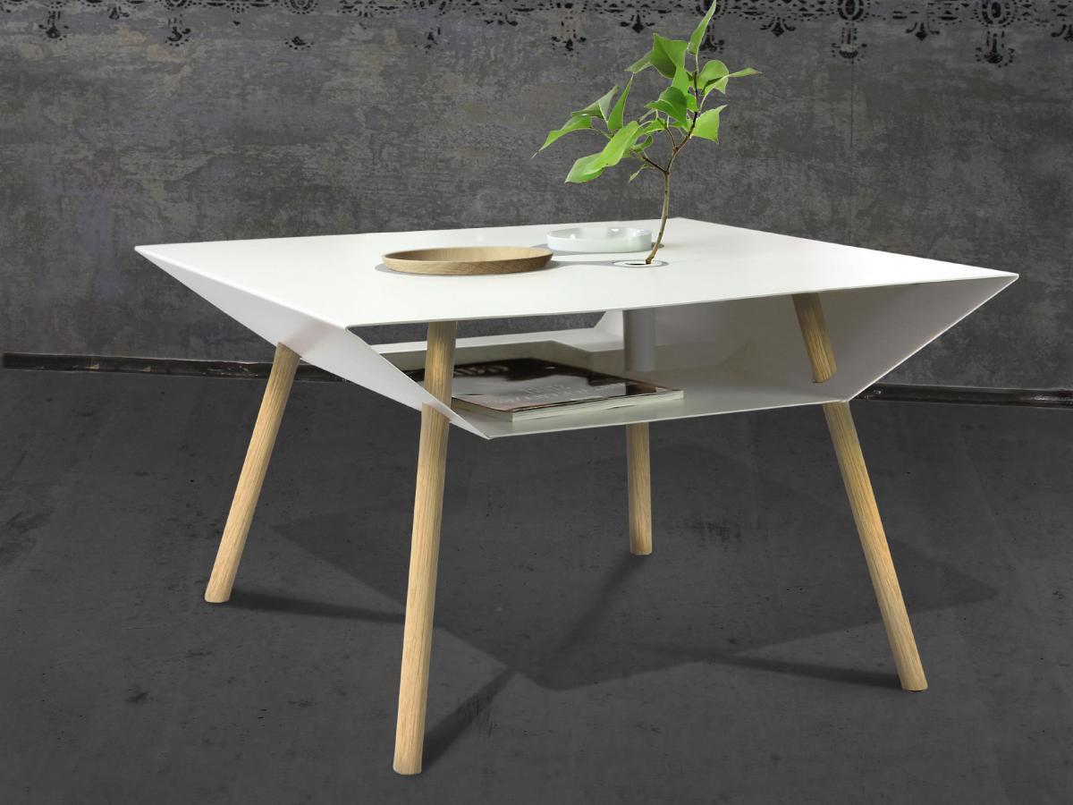 The metal table is available in a timeless design with a white powder coating, with feet and a wooden shell in beech or oak. The integrated vase and the porcelain vessel are also included in the delivery, as is a cover for the latter.