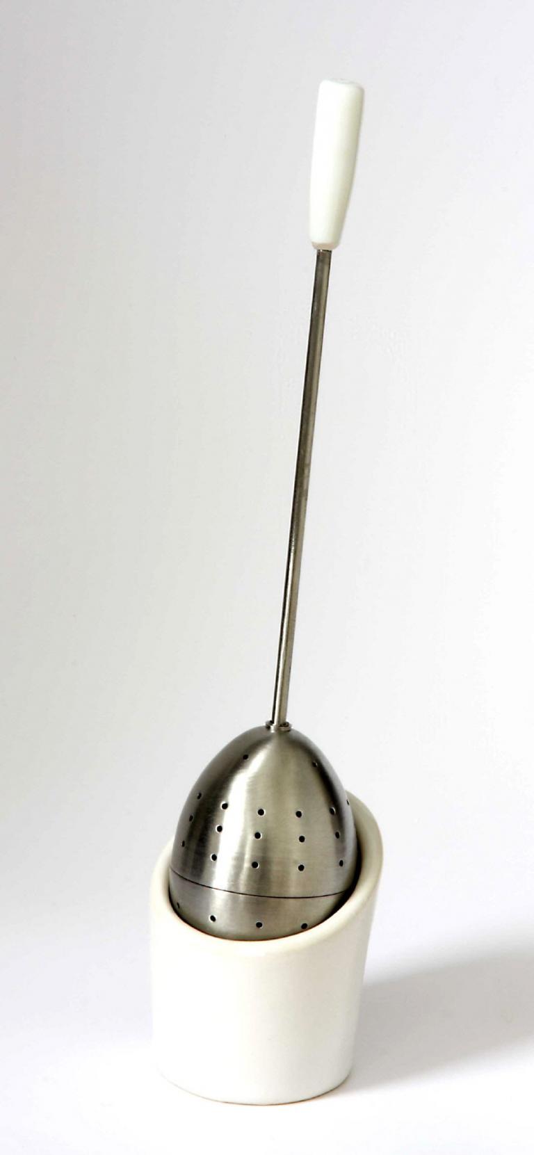 Ein Tee-Ei in Form eines Eies, für losen Tee mit einer Ablage aus weißem Porzellan