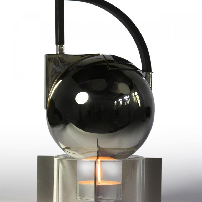 Ein Zylinder aus hitzebeständigem Borosilikatglas schirmt das Teelichter vor Zugluft ab, sorgt für die nötige Hitze und lässt es in einem romantischen Licht erscheinen.