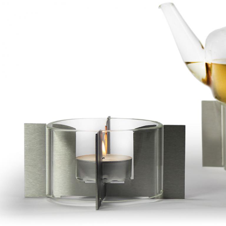 Ob Teekannen mit kleinem oder großem Boden, ob aus Glas, Edelstahl, Porzellan oder Keramik - auf diesem modernen Tee-Stövchen aus Glas und Edelstahl machen sie alle eine gute Figur, lassen frisch zubereiteten Tee nicht erkalten.