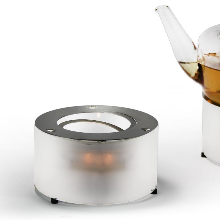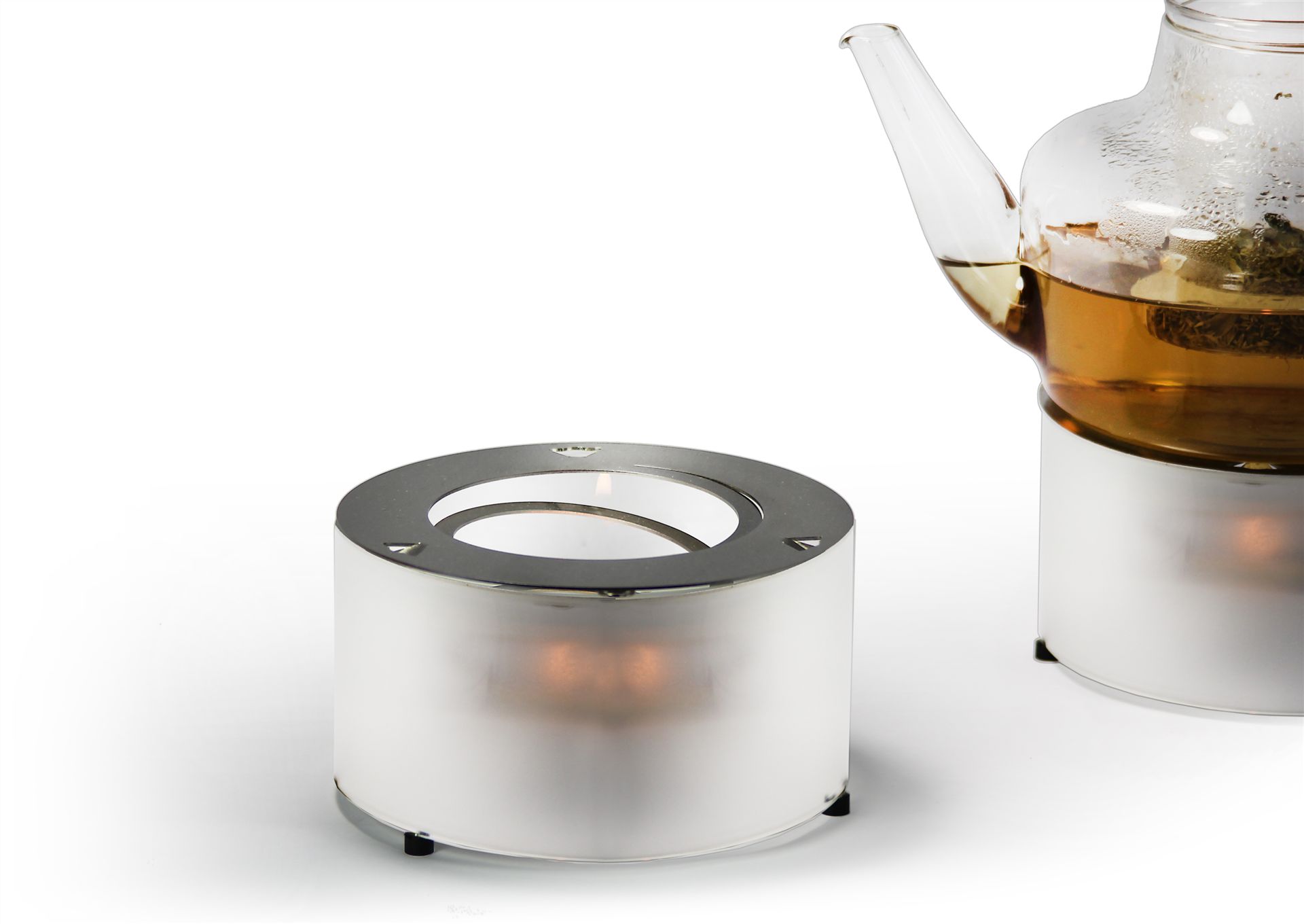 Ein in eine gedehnte Edelstahlspirale eingesetztes Teelicht normaler Größe erzeugt die nötige Wärme, um den Tee in einer Teekanne warmzuhalten. Dabei schirmt ein Glaszylinder aus hitzebeständigem, wahlweise klare oder mattiertem Borosilikatglas das Teelicht vor Zugluft ab, sorgt für die nötige Hitze und lässt es in einem weichen Licht erscheinen. Für Kannen mit Böden mit Durchmesser von max. 11 cm.