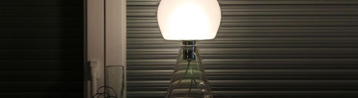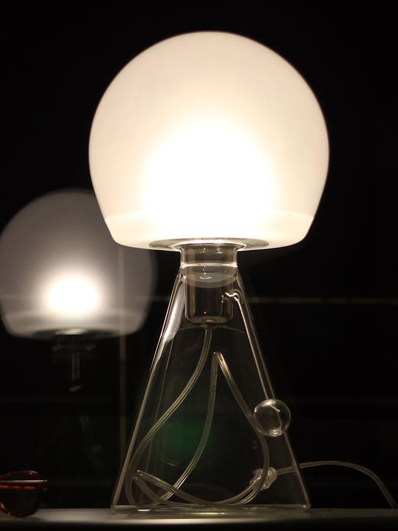 Sie ist von Grundformen geprägt: Auf einem langgestreckten Glaskegel, in dem das Kabel sichtbar gezeigt wird, ruht eine unten abgeflachte Glaskugel. Von innen ist diese mattiert, schafft so einen sanften Lichtschein.
