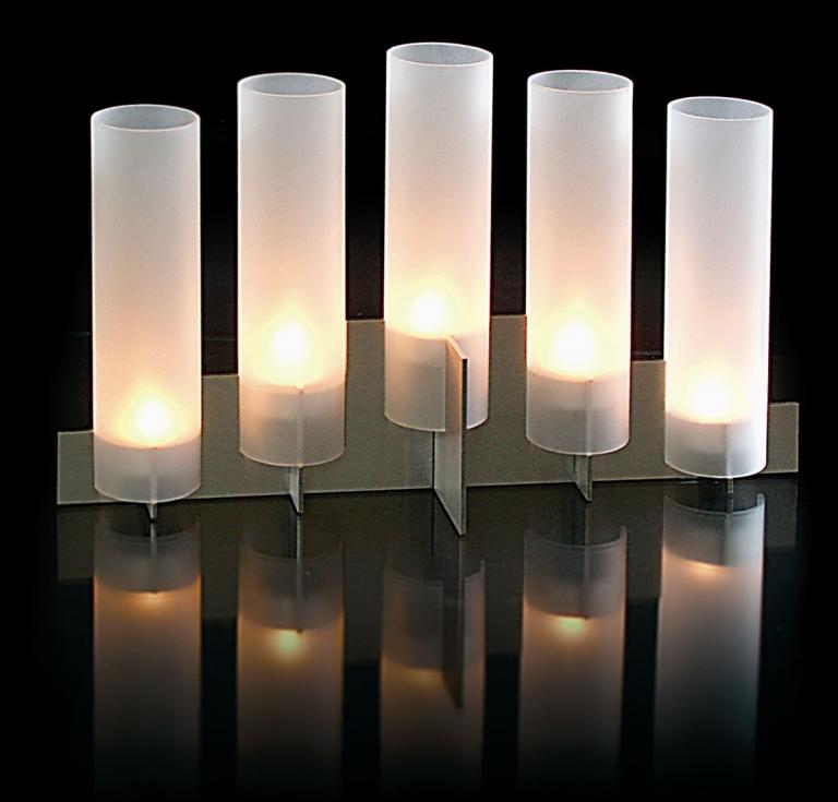 moderner Schwippbogen aus gebürstetem Edelstahl mit sattinierten Glasaufsätzen für ein angenehmes Licht, nicht nur zur Weihnachtszeit für 5 Teelichter Länge ca. 37 cm