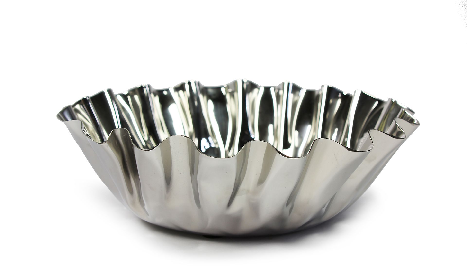 Der Rand eines Edelstahlbleches wird so verformt, dass diese zu einer modernen Schale für Früchte und anderes Obst wird.