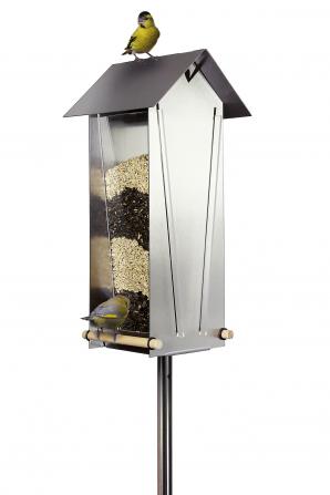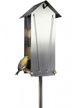 Edelstahl-Vogelhaus mit Edelstahlstab und großem Futterdepot. Dach zum Befüllen leicht abnehmbar.