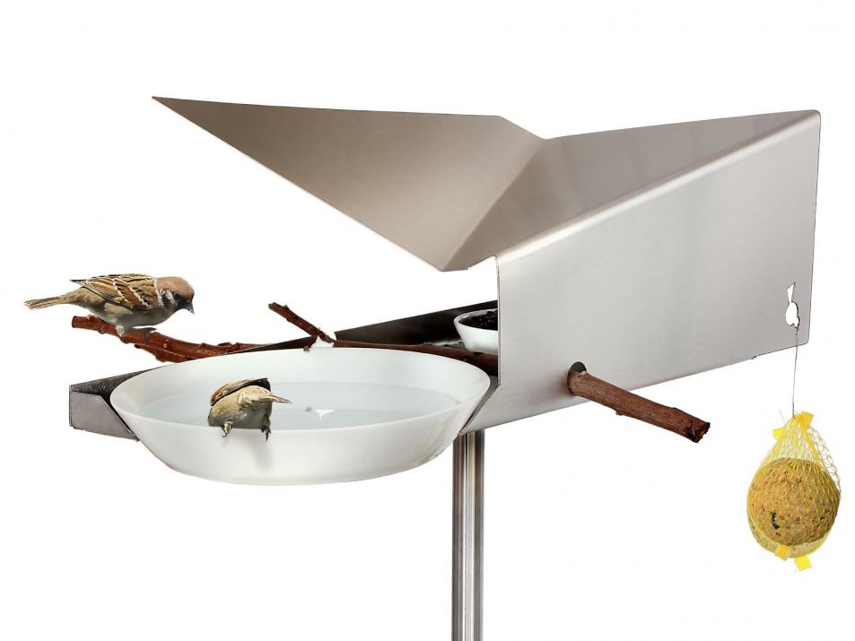 Kombination aus Vogelhaus und Vogeltränke in Edelstahl in modernem Design