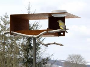 Für alle, denen der Kontrast zwischen Weiß bzw. Edelstahl zur natürlichen Umgebung bei unserem VHT-1-L zu groß erscheint, ist diese Kombination aus Vogeltränke und Vogelhaus in Edelrost die richtige Wahl, fügt sie sich doch sehr dezent in jeden Gartenbereich zwischen bunten Blumenwiesen oder Stauden ein.