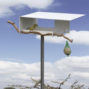 Bei diesem Vogelfutterhaus haben wir uns vom Stil des Bauhauses inspirieren lassen. Dem berühmten Haus am Horn in Weimar liegen Geradlinigkeit, Konzentration auf das Wesentliche, Verzicht auf zierende, überflüssige Elemente, das zur damaligen Zeit absolut unübliche Flachdach, eine helle Fassadengestaltung zugrunde. Wir haben diese gestalterischen Grundsätze auf unser VH-1 übertragen. Das funktional weit überspannende Flachdach schützt hier vor Regen und Schnee. Großzügige Öffnungen laden Vögel zum Picknick ein. Der Ast dient als Landehilfe und Verbindung zur Natur.