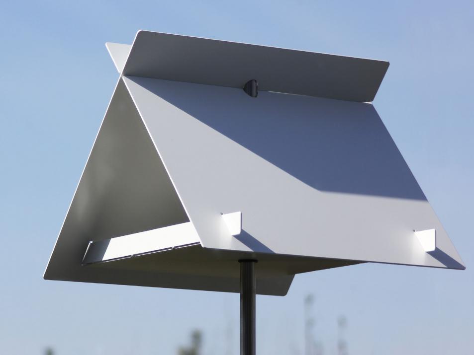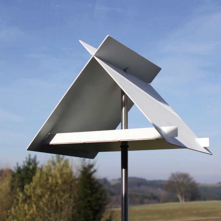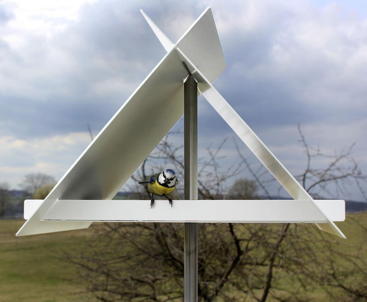 Das klassische Vogelfutterhaus in zeitgemäßen Materialien neu interpretiert: 3 einzelne Teile werden einfach ineinander und anschließend auf den Edelstahlstab gesteckt