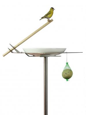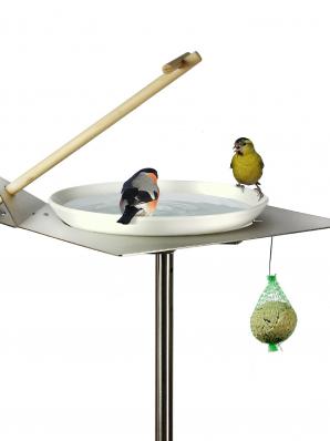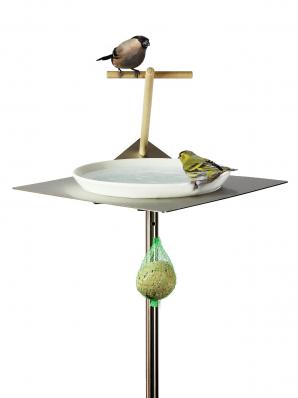 Eine Porzellanschale ist hier in ein quadratisches Metallblech eingelassen. Eine hochgebogene Ecke nimmt einen Buchenholzstab auf, dient als willkommener Landesteg für Meise & Co.