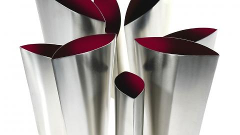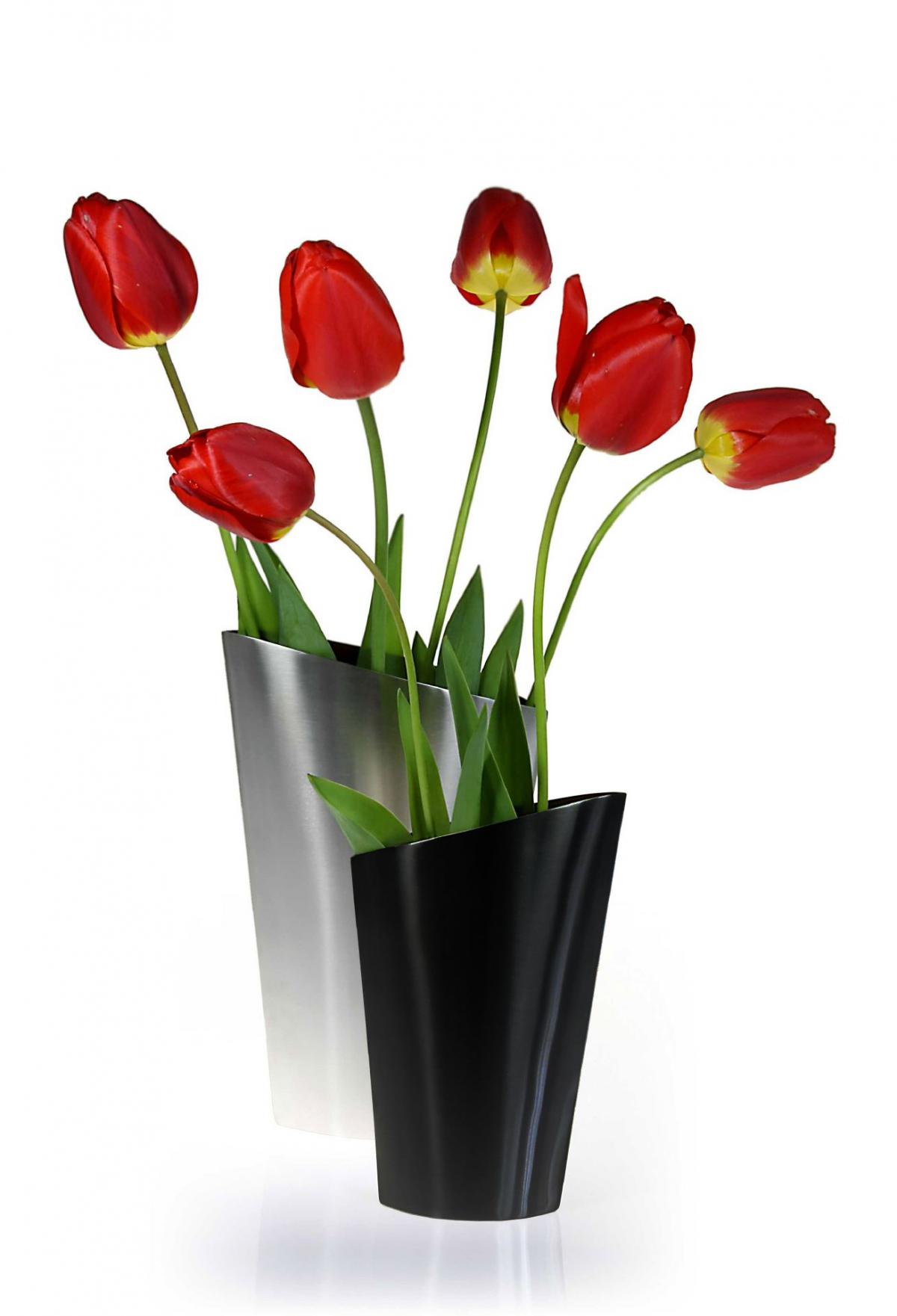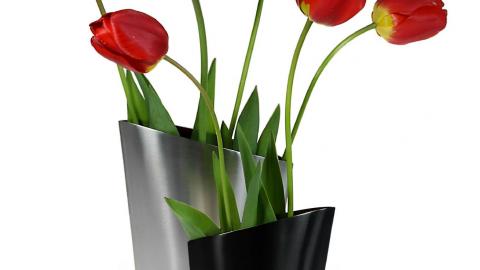 Ein Blatt stand Pate bei der Gestaltung, von oben leicht zu erkennen. Dieses Vasen-Set besteht aus 2 flachen Vasen aus gebürstetem Edelstahl oder in schwarz-weißer Lackierung, mit einem verstärkten Boden für einen sicheren Stand