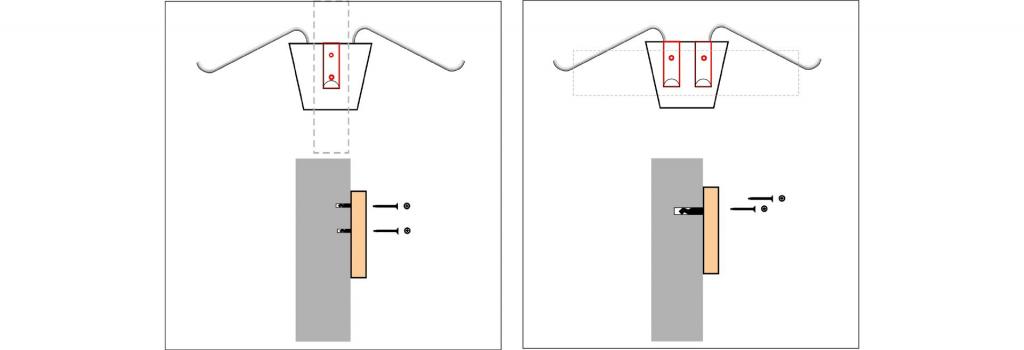 For holders with one hook, the holes for the screws are one below the other, for holders with 2 hooks they are next to each other.