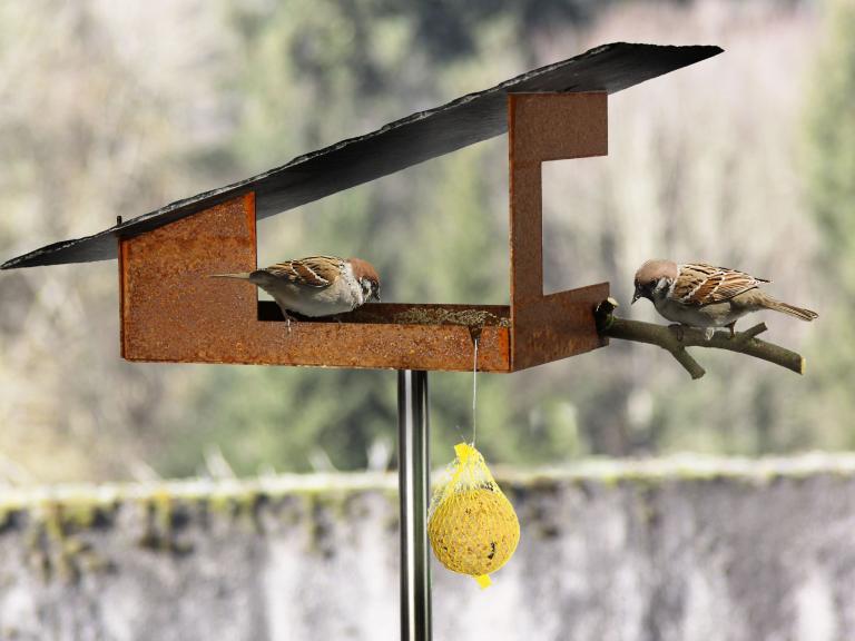 Discover the perfect symbiosis of metal and nature in our modern bird houses*, bird baths and bird feeders. Our products cleverly combine stainless steel, aluminum or Corten steel with natural branches to create a harmonious whole.