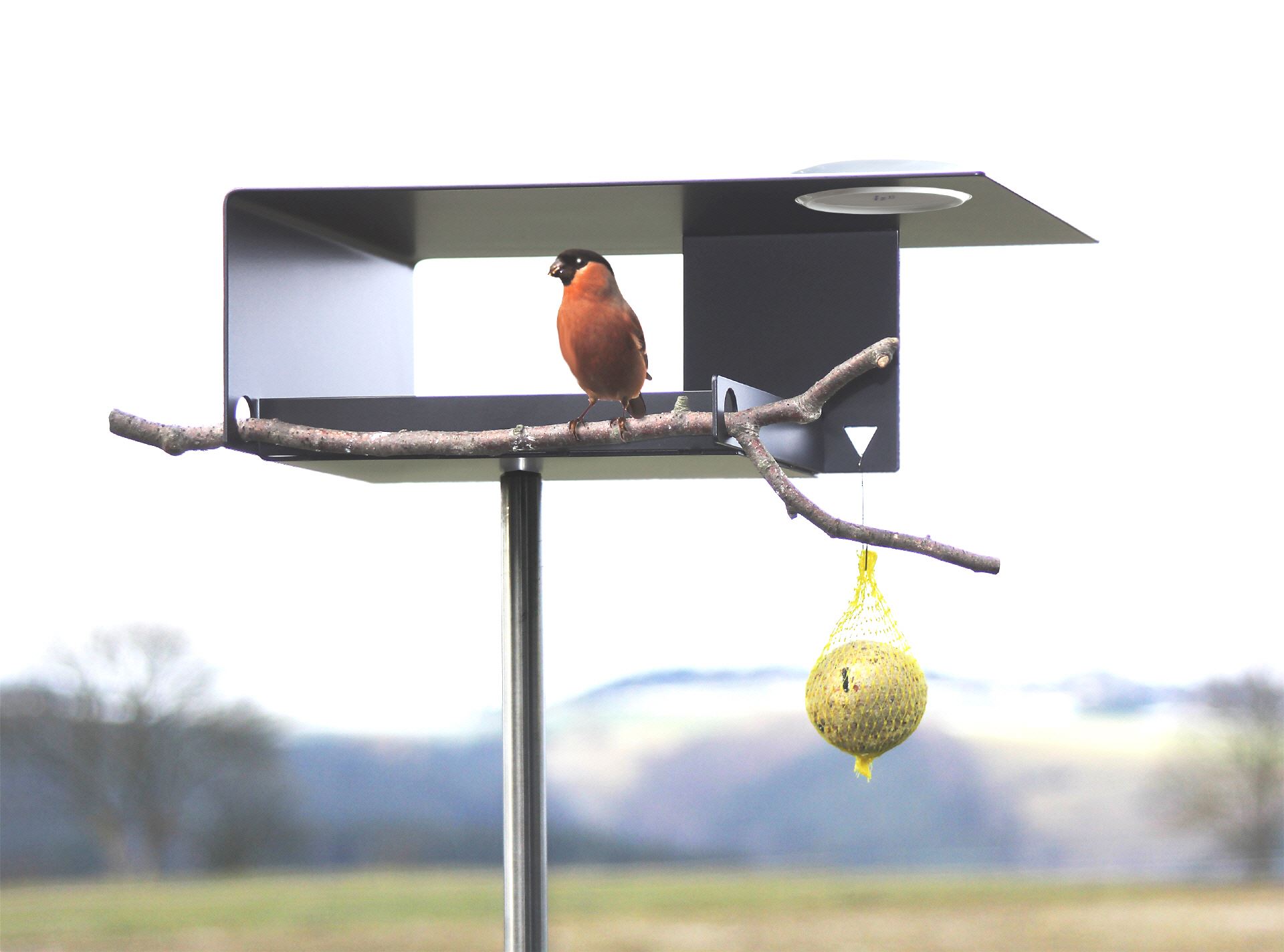 Our dark grey version of the VHT-1. A combination of a bird feeder with a small drinking trough in the roof area. In winter, the porcelain bowl can also be used as an additional feeding place.