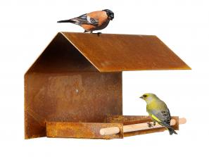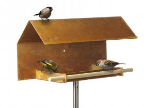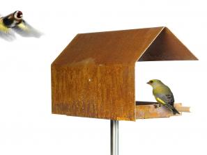 Modified from our VH-2 bird feeder, we offer a longer version with a pointed roof made of Corten steel. The rod is inserted horizontally like our VH-9 and is included in the scope of delivery.