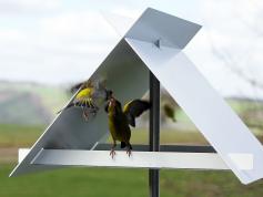 A bird feeder in the shape of a roof