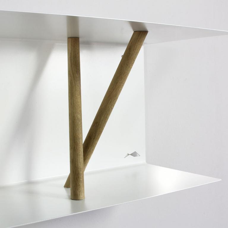 With this metal wall shelf, a laser-cut metal sheet is folded into a U-shape and powder-coated. Wooden sticks are clamped in and serve as unobtrusive supports for books.