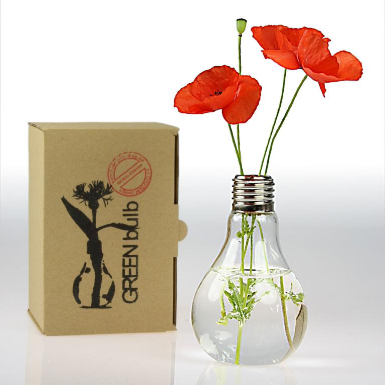 a vase in the shape of a light bulb, in our production program since 2001. It consists of borosilicate glass, a screwable base element. A flat base ensures a secure stand.