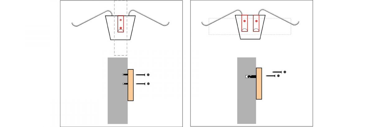 Bei Haltern mit einem Haken sind die Löcher für die Schrauben untereinander, bei Haltern mit 2 Haken nebeneinander angebracht.