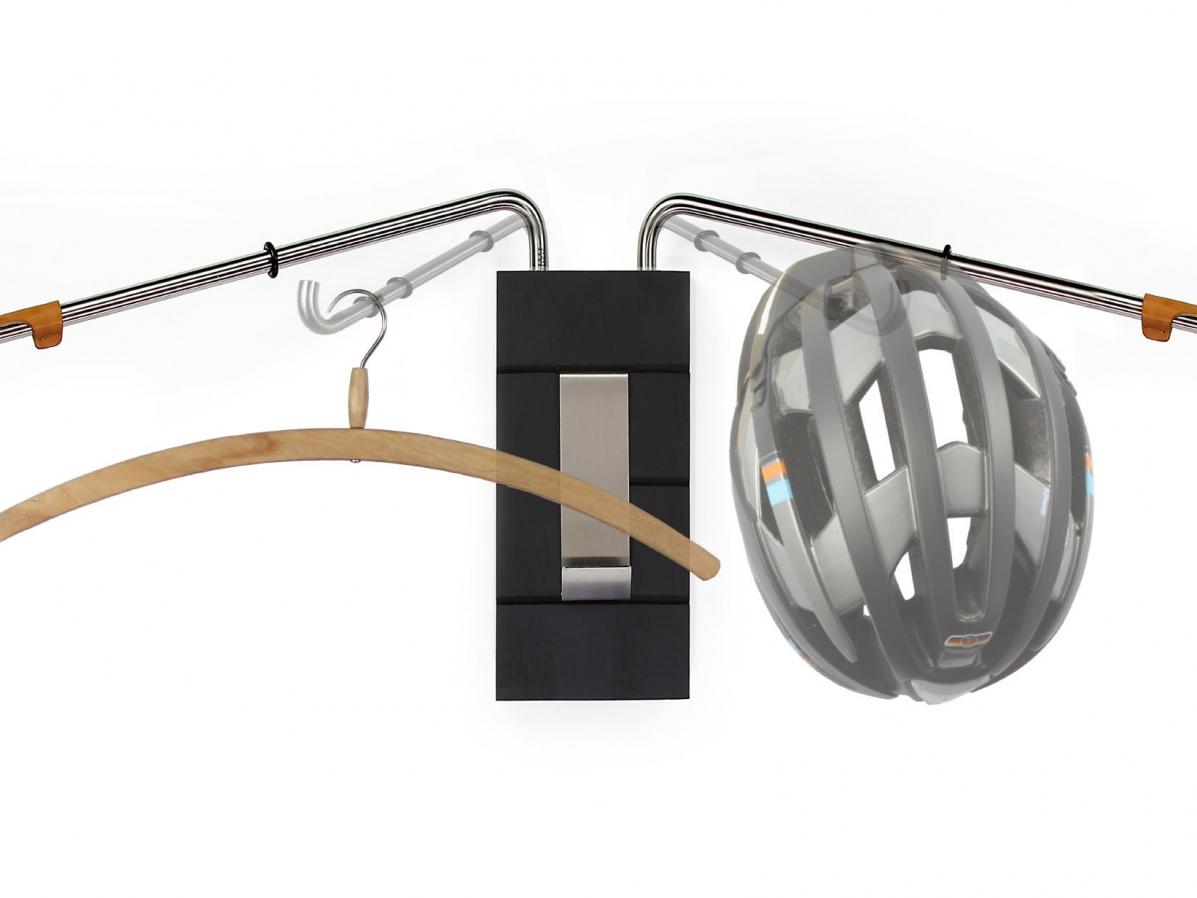 Ohne Fahrrad lassen sich die Arme aus massivem Edelstahl flach an die Wand klappen. Nichts ragt in den Raum hinein. Mit Kleiderbügeln bestückt, werden die Fahrradhalter zu extravaganten Wandgarderoben.