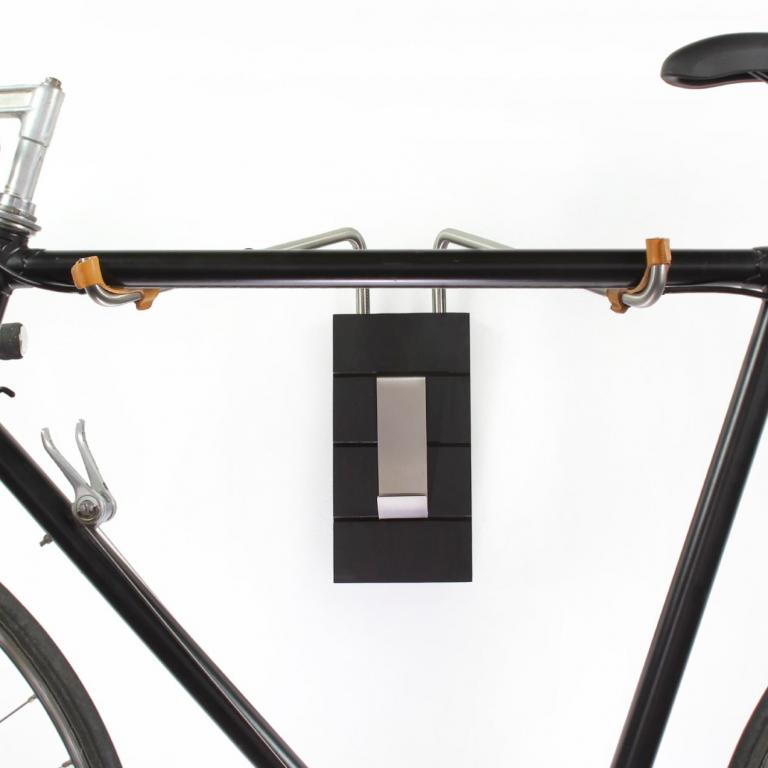 Im Gegensatz zu unseren anderen Wandhalterungen ist das Holzteil in Rechteckform ausgebildet und mit 3 Querschlitzen unterteilt. Diese dienen einerseits zur Aufnahme von Wohnungs- oder Fahrradschlüssel, andererseits lassen sich hier die Arme in 3 verschiedenen Höhen verstellen. Eine Münze einfach in den entsprechenden Schlitz der Fahrradhalterung gesteckt und schon ist der Arm in der Höhe arretiert.