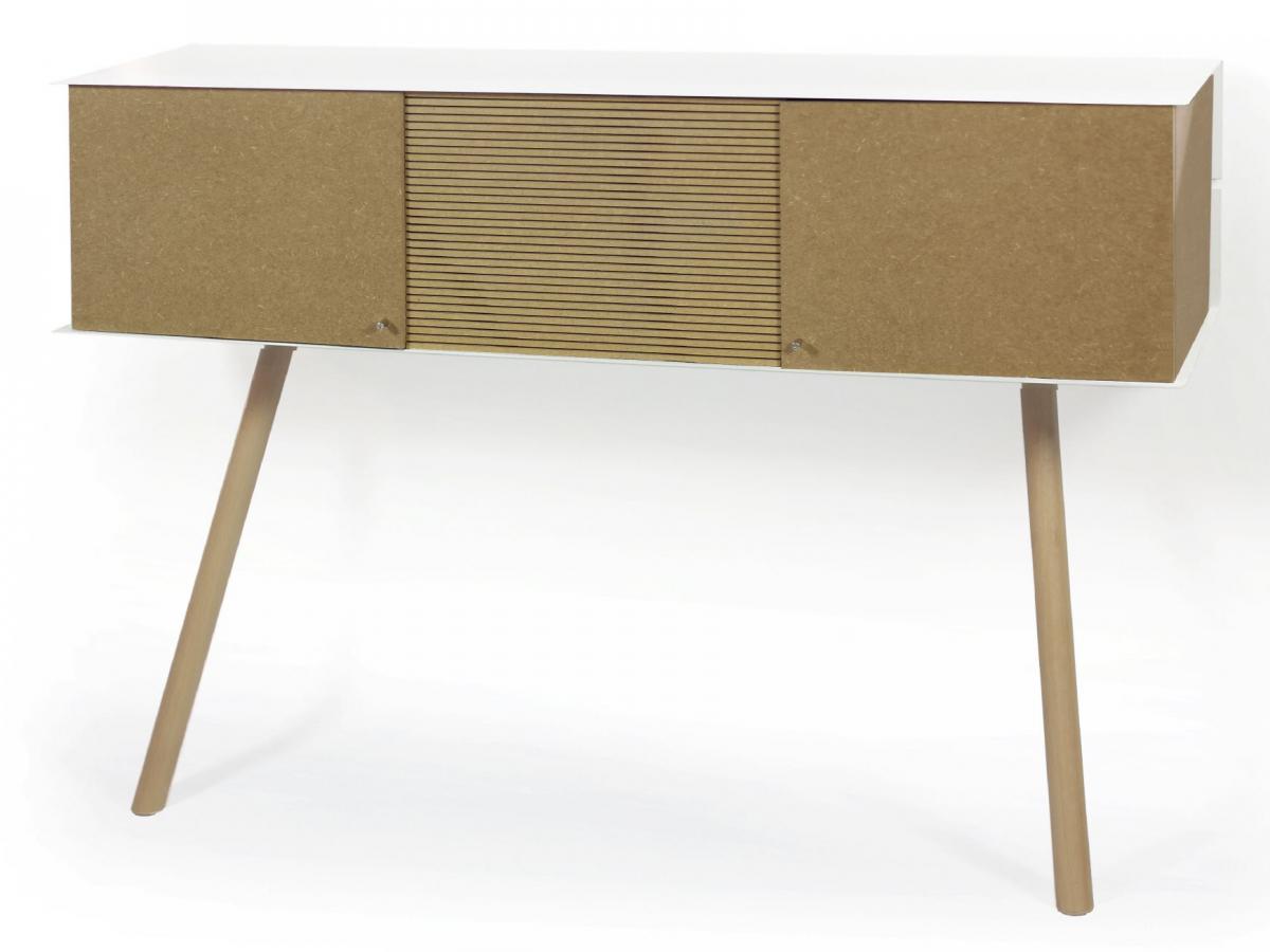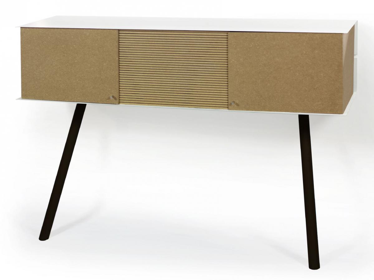 Sein Schwerpunkt ist so gelegt, dass dieser Schrank - man könnte ihn auch als Sideboard oder Kommode bezeichnen - nur an die Wand gelehnt wird. Zwei schräggestellte Füße aus gewachstem Buchenholz sorgen dabei für einen sicheren Stand. In dem edel matt-weiß pulverbeschichteten Metallkörper in U-Form sind kontrastreich die Seitenteile und Türelemente aus MDF eingearbeitet. Das mittlere Element ist dabei als Schiebetür in geschlitztem MDF ausgelegt.