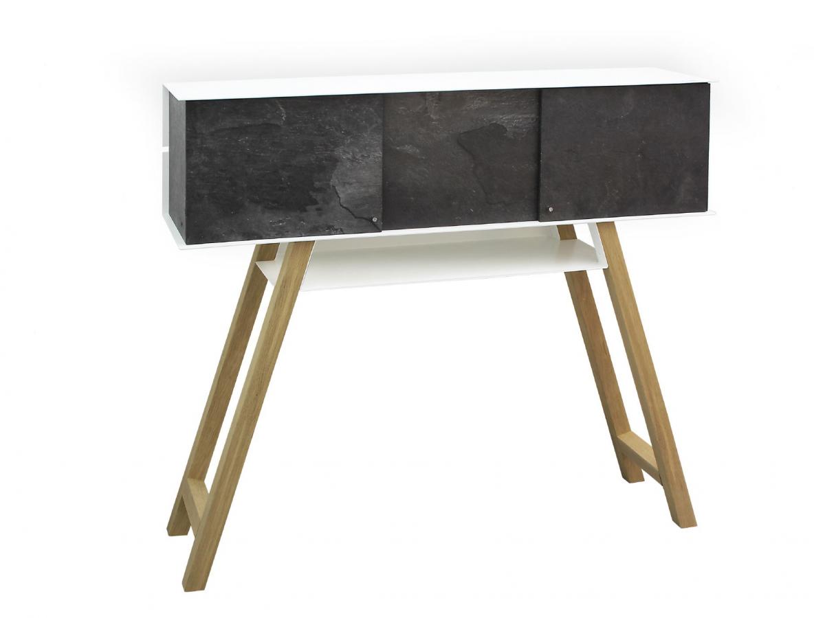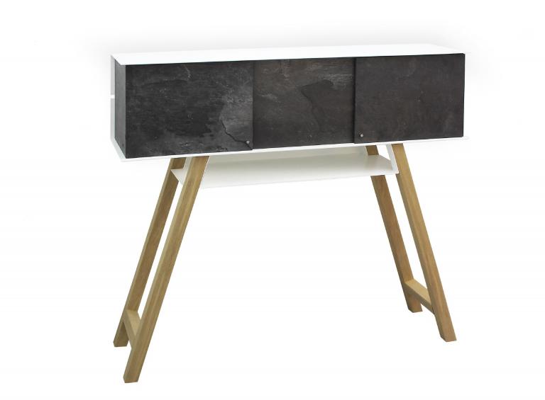 Unser Sideboard S-01, basierend auf dem Anlehnschrank LS-01-schiefer. mit 4 Füßen aus Eichenholz und einem zusätzlichen Ablagefach benötigt diese Kommode keine Wand zum Anlehnen. Zum edel matt-weiß pulverbeschichteten Metallkörper kontrastieren die Türen aus Schieferlaminat. Die Mitteltür lässt sich schieben, die linke und rechte Tür sind als normale Türen mit seitlichen Scharnieren ausgebildet.