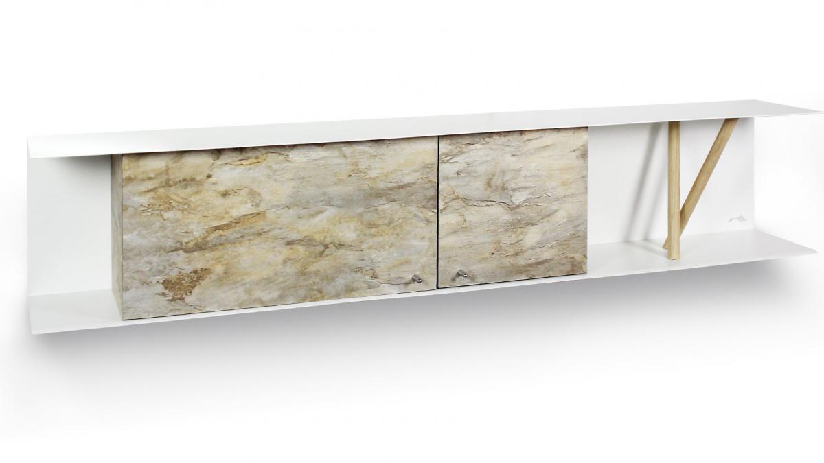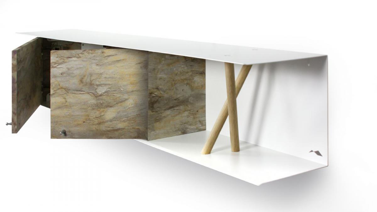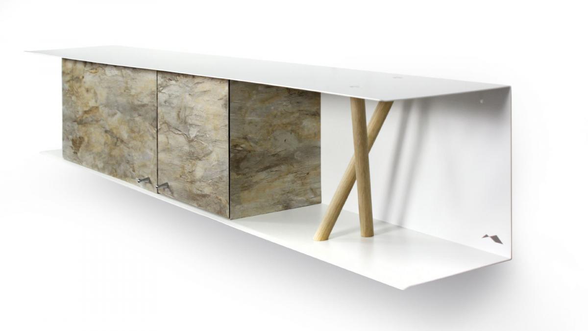 Sideboard / Wandregal aus pulverbeschichtetem Metall und einem integrierten Fach aus MDF, Baubuche, Stein-, Rost- oder Schieferlaminat