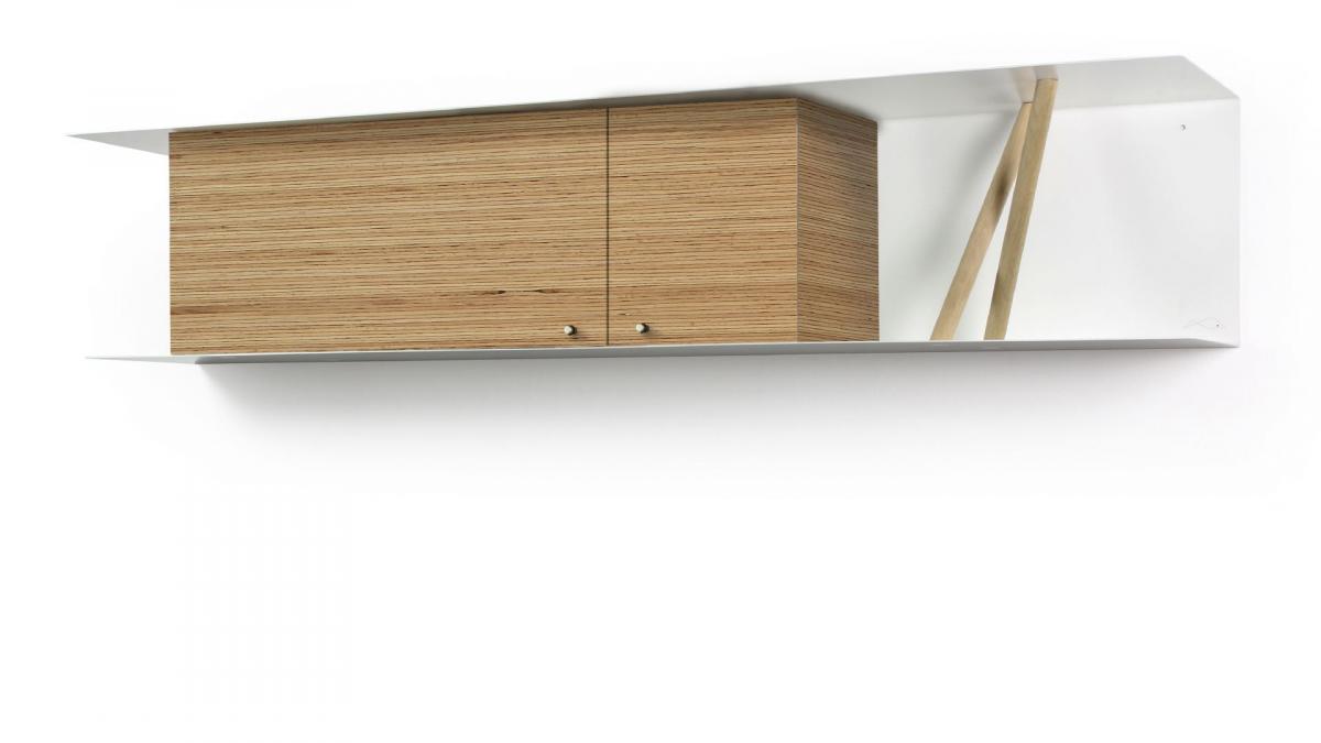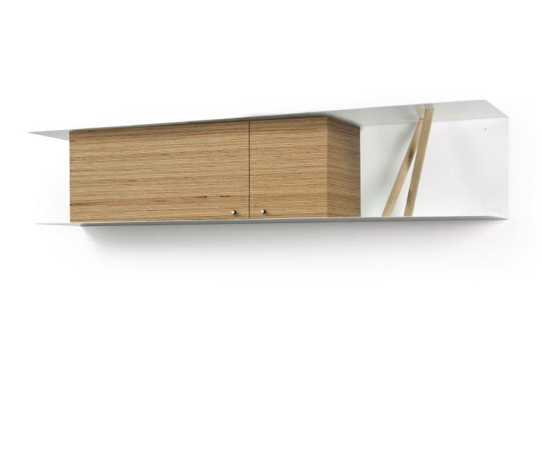 C-11 ist ein Sideboard in einem außergewöhnlich modernen Design. Zum edel mattweiß pulverbeschichteten Metallkörper kontrastiert das Türelement aus gewachsten, gerillten mdf- oder Baubuche