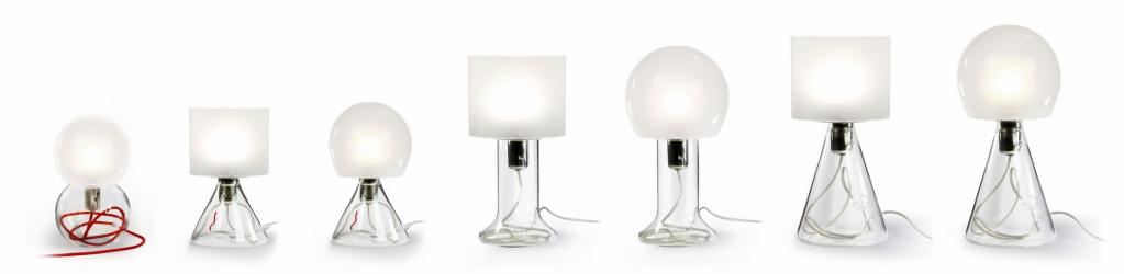 eine lampe im stil der Klassischen Moderne, mundgeblasen aus besonders klarem borosilikatglas für moderne leuchtmittel wie led, überschüssiges kabel kann in den standfuß geschoben werden, ca. 39 x 18 cm