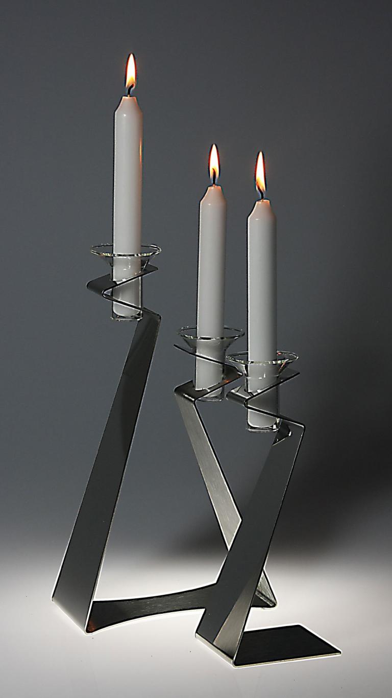 raffinierter kerzenständer aus edelstahl, für eine bzw. für 2 tafelkerzen mit durchmesser 21,5mm die außenseiten sind poliert, die innenseiteist gebürstet.
