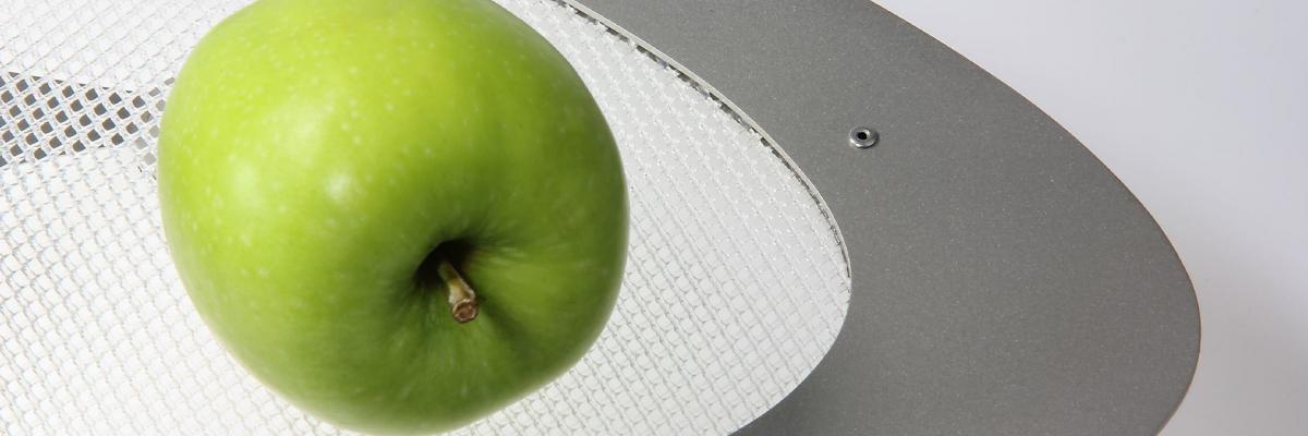 In einem Rahmen aus glasperlengestrahltem Edelstahl ist ein Gitternetz eingespannt, lässt die Früchte weich und ohne Druckstellen ruhen.