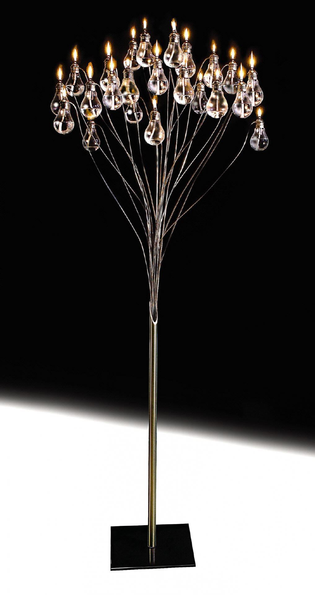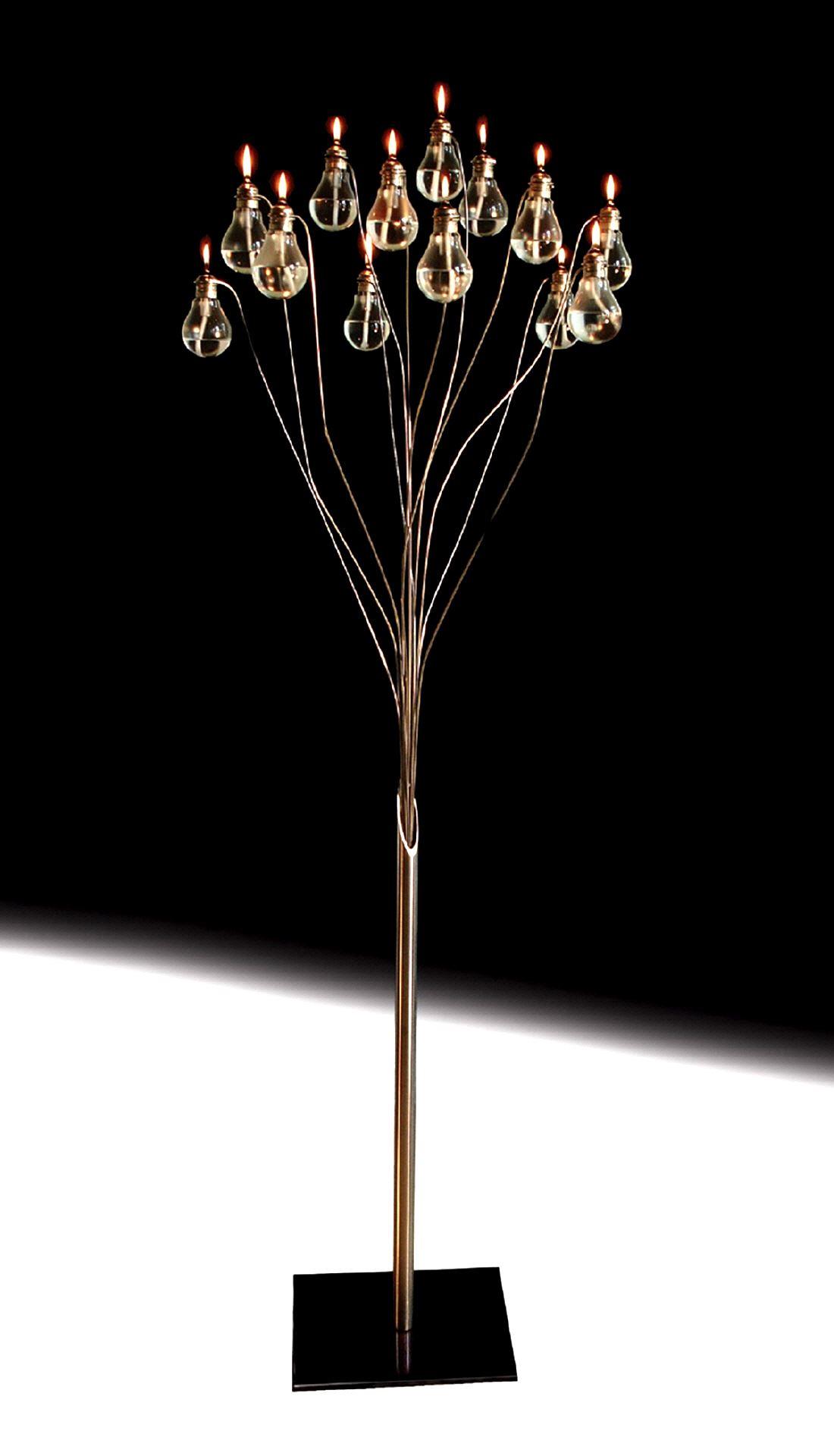 Öllampen-Baum mit 12 oder 24 "Glühlampen". Edelstahldrähte als Äste, Zweige halten die Glühlampen, "wachsen" aus einem (Edelstahl-) Stamm heraus.