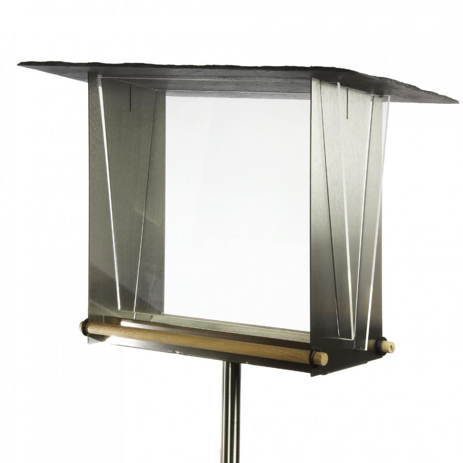 Vogelhaus in Edelstahl mit großem Vorratsdepot.Diese Futterstelle besticht durch ihr geradliniges Design und den großen, beidseitigen Sichtfenstern. Füllt man verschiedene Vogelfuttersorten wie schwarze und geschälte Sonneblumenkerne ein, entsteht durch das Aufpicken und Nachrutschen täglich ein neues Bild. Mit Dach aus Naturschiefer.