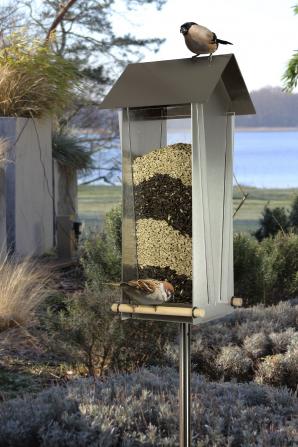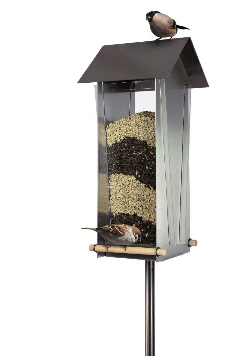 Edelstahl-Vogelhaus mit Edelstahlstab und großem Futterdepot. Dach zum Befüllen leicht abnehmbar.