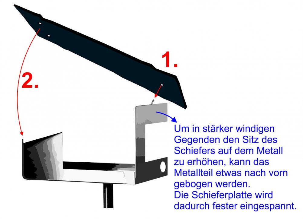 Weht bei Ihnen immer etwas kräftiger der Wind, können Sie auch, wie nebenstehend blau abgebildet, die Spannung, mit der die Schieferplatte gehalten wird, erhöhen.
