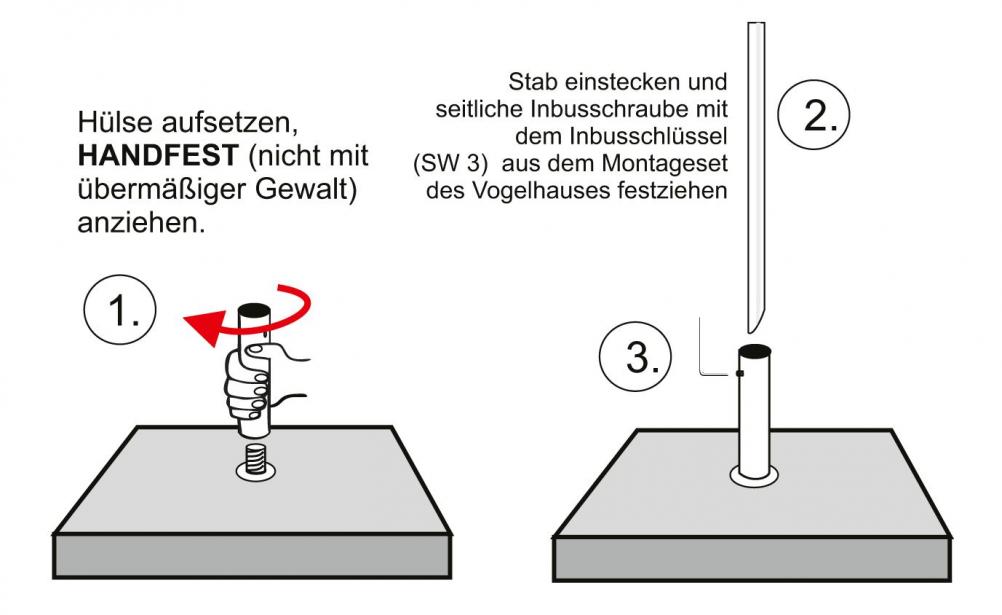 Eine beigefügte Edelstahlhülse wird auf den Betonfuß handfest aufgeschraubt, anschließend der Stab des Vogelhauses eingesteckt. Mit dem Inbusschlüssel aus dem Montageset des Vogelhauses ziehen Sie die seitliche Inbusschraube der Hülse leicht fest. Sollte Ihr Stab im unteren Bereich ein seitliches Loch haben, ignorieren Sie dieses einfach. Die Inbusschraube kann nicht (und soll auch nicht) in dieses Loch greifen.