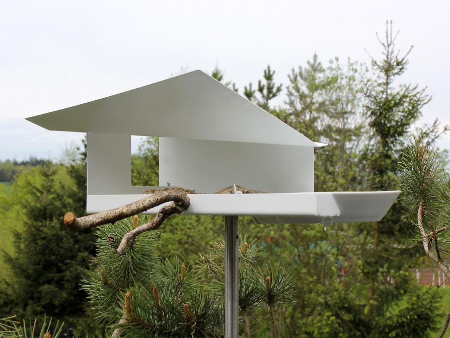 Ein großes Dach füllt die Vogeltränke mit Wasser und schützt das Futter vor Nässe