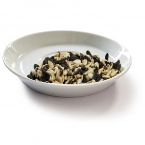 Die von Arzberg-Porzellan gefertigten Schalen sind selbstverständlich abnehmbar, lassen sich dadurch leicht reinigen. Auf einem hohen Edelstahlstab ruhend, schützt diese Futterstelle die Vögel vor allzu hungrigen Katzen.
