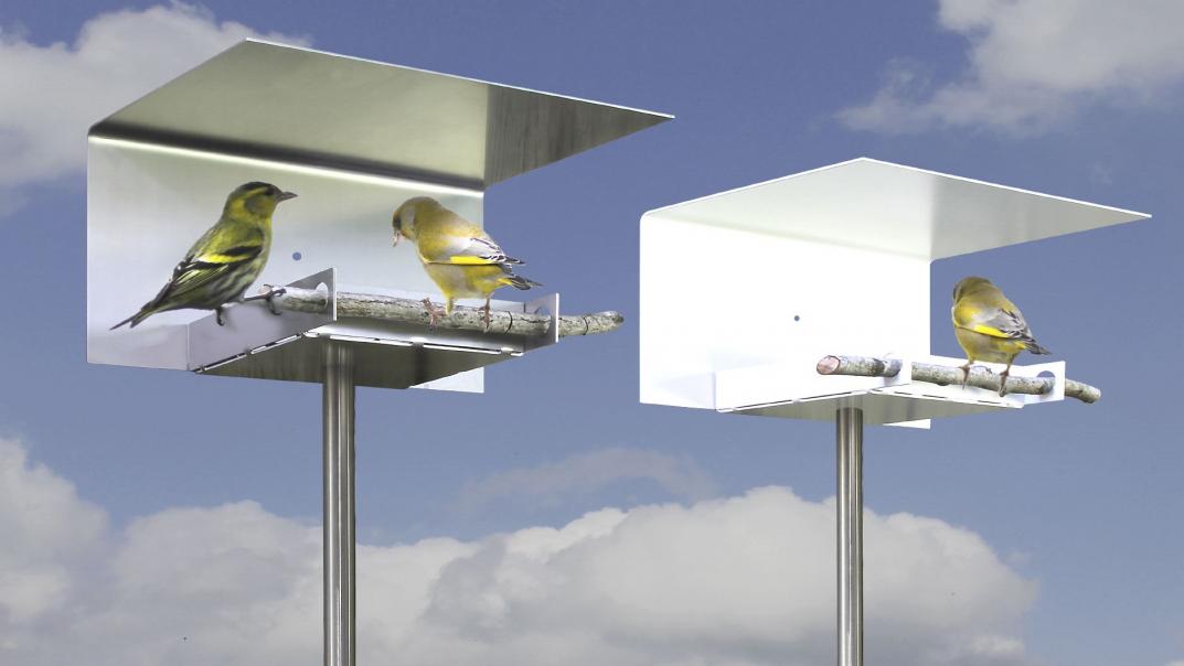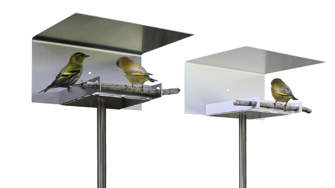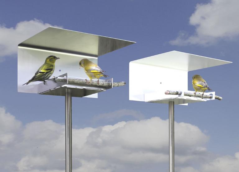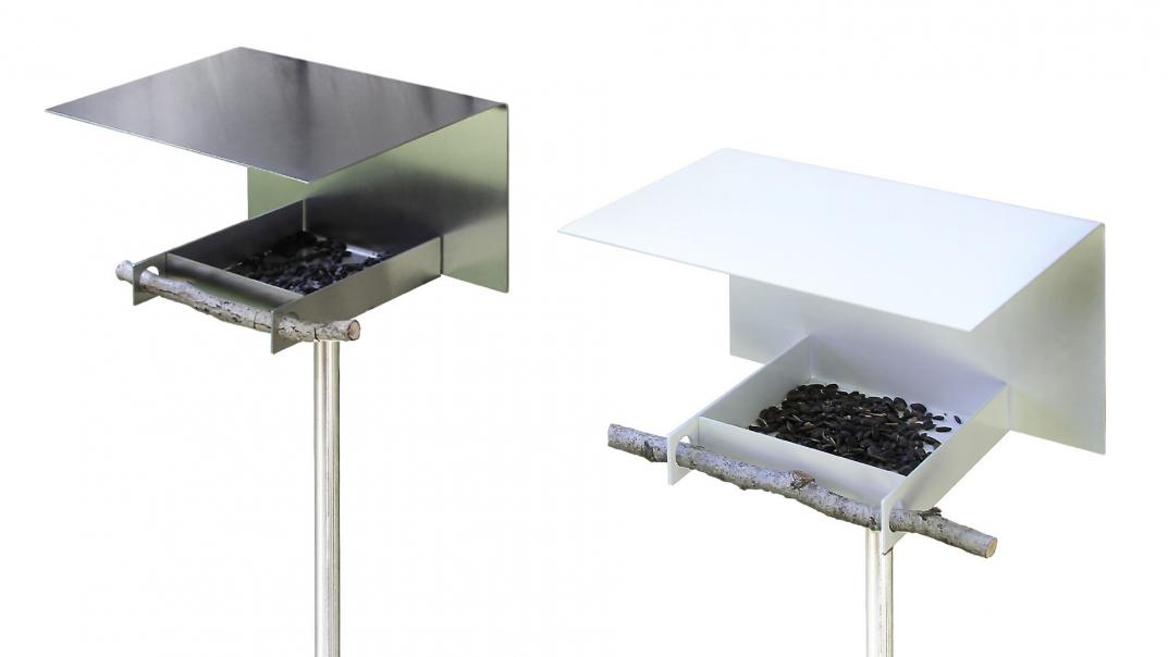Kaufen können Sie dieses moderne Vogelhaus in zwei Varianten: in gebürstetem Edelstahl oder auch mit einem Aufpreis in einer weiß pulverbeschichteten Ausführung.