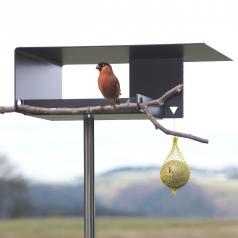 Moderne, zeitlose Architektur im Bauhaus-Stil prägt diese Futterstelle. Ein weit überspannendes Dach schützt dabei ausreichend vor Regen und Schnee. Als Material kommt weiß pulerbeshichtetes Aluminium zum Einsatz, sehr robust und absolut rostfrei.